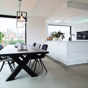 De voorheen verschillende afzonderlijke ruimtes op de benedenverdieping werden omgevormd tot één grote leefruimte met een nieuwe keuken. Het plaatsen van een staalconstructie was noodzakelijk om dit te realiseren. De geplaatste uitbouw strekt zich over de volledige breedte uit en is geheel voorzien van glas, waardoor het ruimtelijke aspect van het nieuwe ontwerp nog meer tot zijn recht komt.